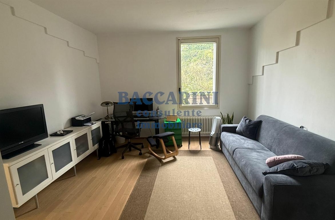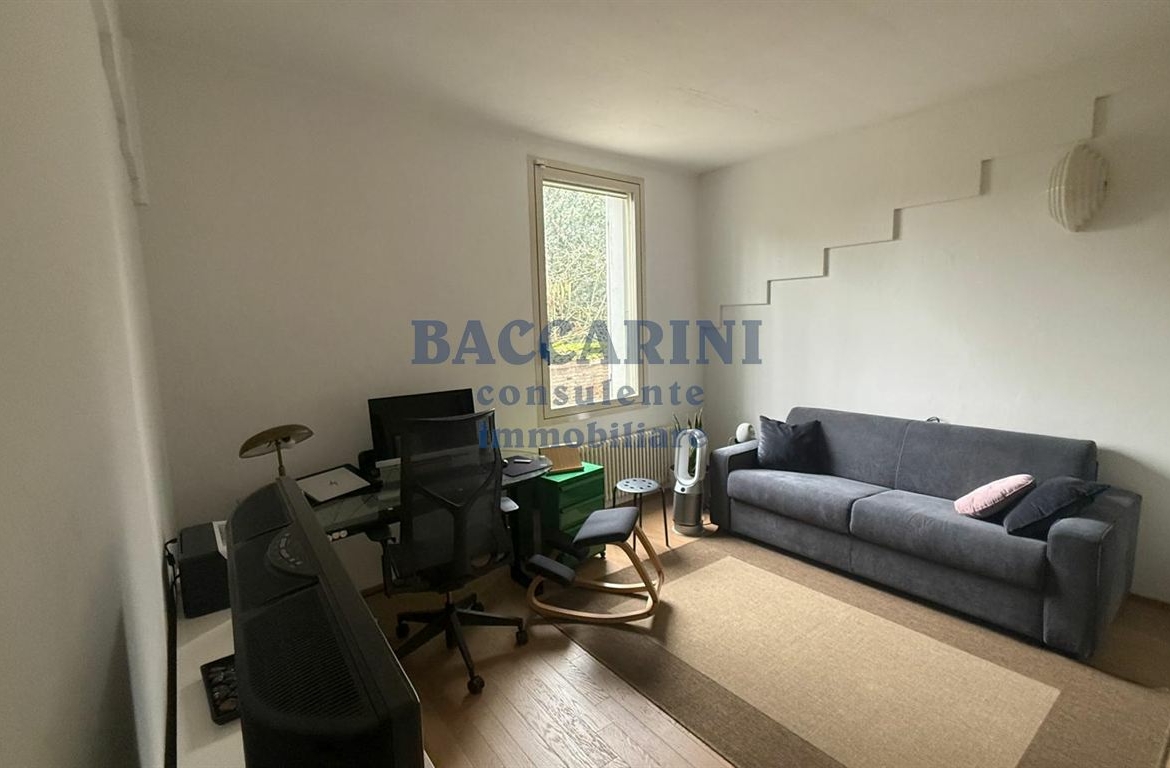 Al primo piano troviamo ingresso su vano perfetto per uso studio, camera, ampio soggiorno in parte verandato con accesso al balcone, ripostiglio sottoscala e bagno finestrato.